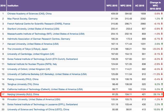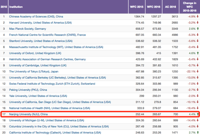 The index of Nanjing University increased by 4.4% (252.44 - 263.67) from 2015 to 2016, and this year, its rankings have also steadily improved (in 2016, Nanjing University ranked the 25th among global scientific research institutions, the 20th among world universities, and the 4th among the Asia-Pacific universities).