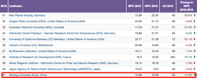 In comparison with its standing in chemistry, China is relatively weak in the field of earth and environmental sciences. Next to the Chinese Academy of Sciences and the Institute of Atmospheric Physics under the Chinese Academy of Sciences, Nanjing University is the highest-ranking Chinese institution, ranking the 41st among global institutions and the 1st among Chinese universities. Its index increased by 15.6% (15.99 - 18.48) from 2015 to 2016.