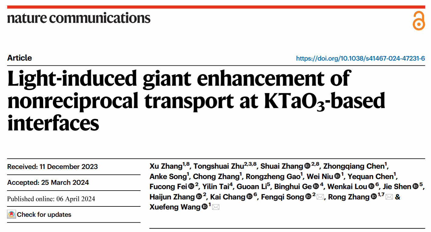 These interesting results were published in the reputed journal of Nature Communications on April 6, 2024 (DOI Foundation-024-47231-6), which is entitled “Light-induced giant enhancement of nonreciprocal transport at KTaO3-based interfaces.” PhD student Zhang Xu, Dr. Zhu Tongshuai and Dr. Zhang Shuai contributed equally to this work. The corresponding authors are Prof. Wang Xuefeng, Prof. Zhang Rong and Prof. Song Fengqi .