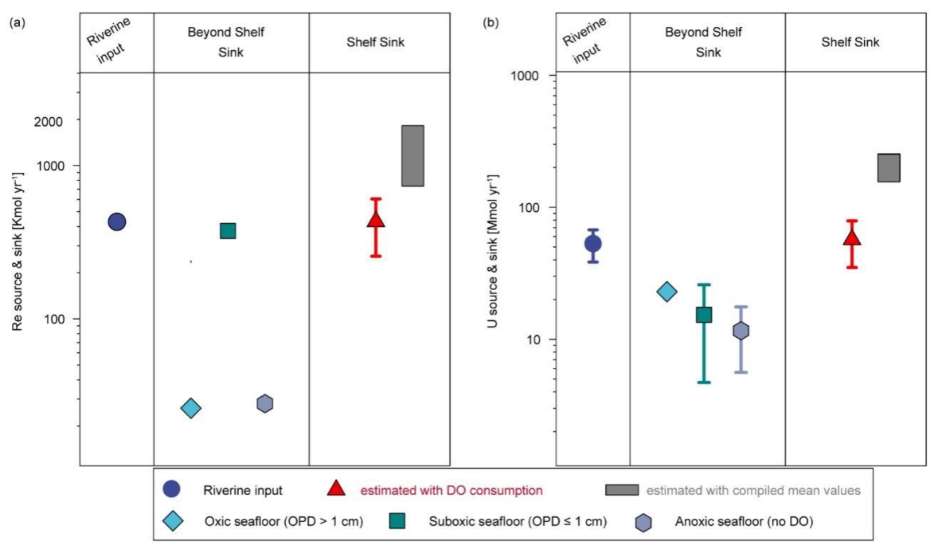Shelf sediments (depth <200 meters) are the main avenue of organic carbon burial and hotspots for organic carbon mineralization. The abundant input of organic matter leads to rapid consumption of oxygen in pore water of shelf sediments, resulting in anoxic conditions. This, in turn, causes dissolved Re and U in pore water to be removed and reduced into sediments as electron acceptors, constituting a sink for marine Re and U. However, the importance of continental shelves in past source-sink studies has not been quantitatively evaluated.