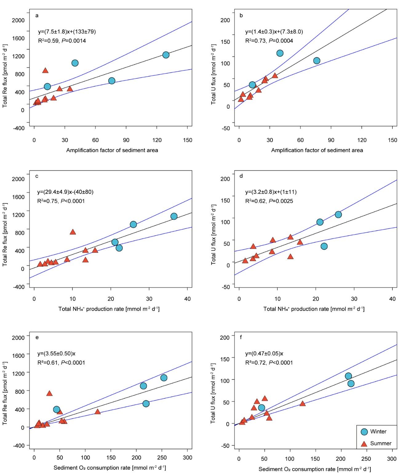 Figure 1. Correlation between shelf sediment Re and U fluxes and coefficients of sediment irrigation (a, b), anaerobic organic carbon decomposition rates (c, d), and sediment oxygen consumption rates (e, f).
