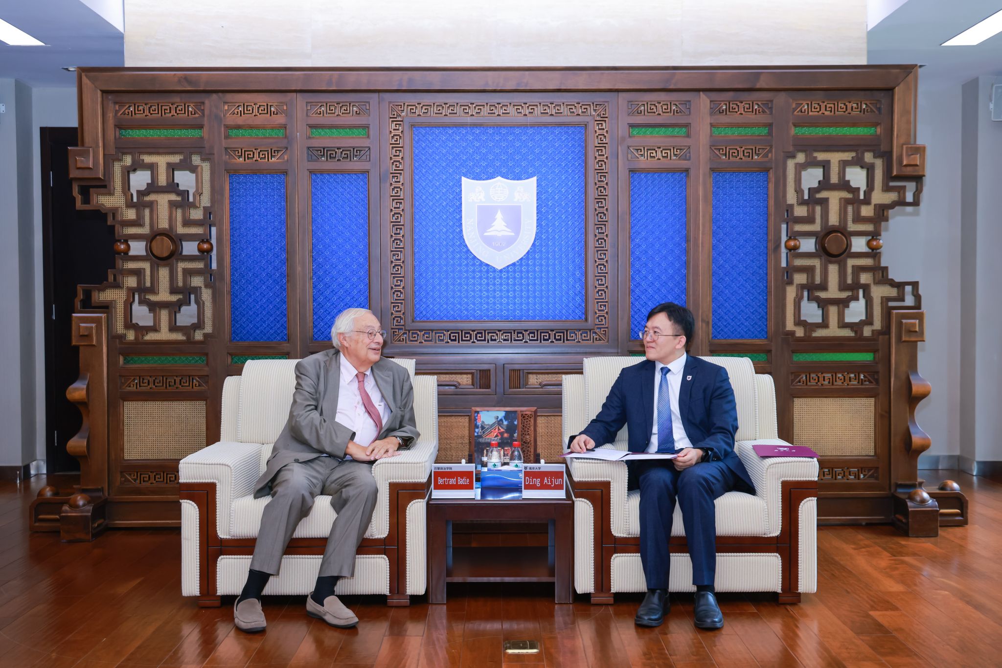 Ding expressed a warm welcome to Professor Badie and the delegation. He briefly introduced the latest developments of NJU, including updates on the Suzhou Campus and advancements in internationalization efforts, area studies, and the Department of French. NJU places great importance on French language teaching and works on strengthening educational, scientific, and cultural collaboration with France, which fosters Sino-French friendship and promotes understanding and mutual learning of diverse cultures. Ding expressed NJU's strong willingness to deepen cooperation with French colleges, universities and research institutions on global issues such as climate change.