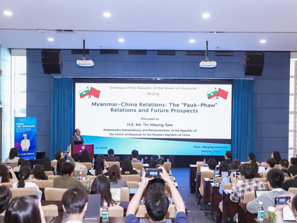 会后,吴丁貌瑞大使在我校发表题为“中缅关系:‘胞波’情谊与未来展望”主旨演讲,包括缅甸等东盟国家留学生在内的百余名中外学生和老师到场聆听。吴丁貌瑞大使深情回顾了缅中“胞波”友谊历史和双边关系发展历程及成果,表示缅致力于发展中缅命运共同体,愿在深化东盟中国全面战略伙伴关系中发挥积极作用。