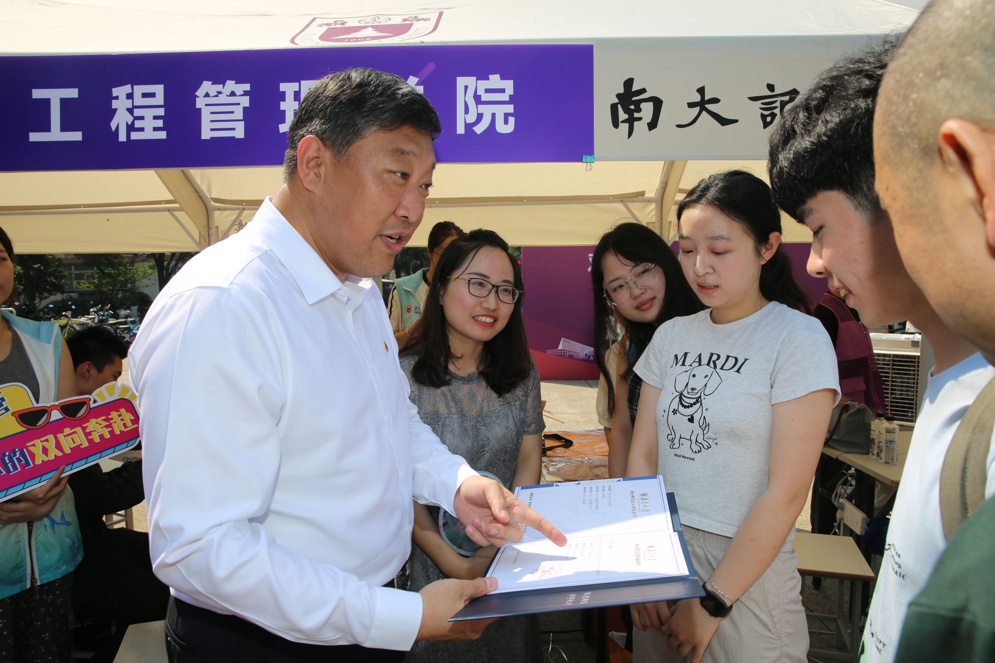 校党委书记、中国科学院院士谭铁牛走访仙林校区迎新接待站、学院报到处、学生宿舍等地,看望新生和送学家长,现场考察迎新工作。