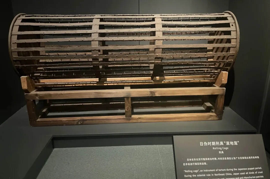 馆内有一件藏品十分醒目,是日伪时期刑具“滚地笼”。当时,日本侵略者残害东北同胞的手段极其残忍,“滚地笼”的内壁镶满铁钉,钉尖向内,一侧可打开。他们把中国人捆绑后塞进笼子里,在地上迅速滚动,里面的人顷刻间皮开肉绽,几乎没有人能幸存下来。