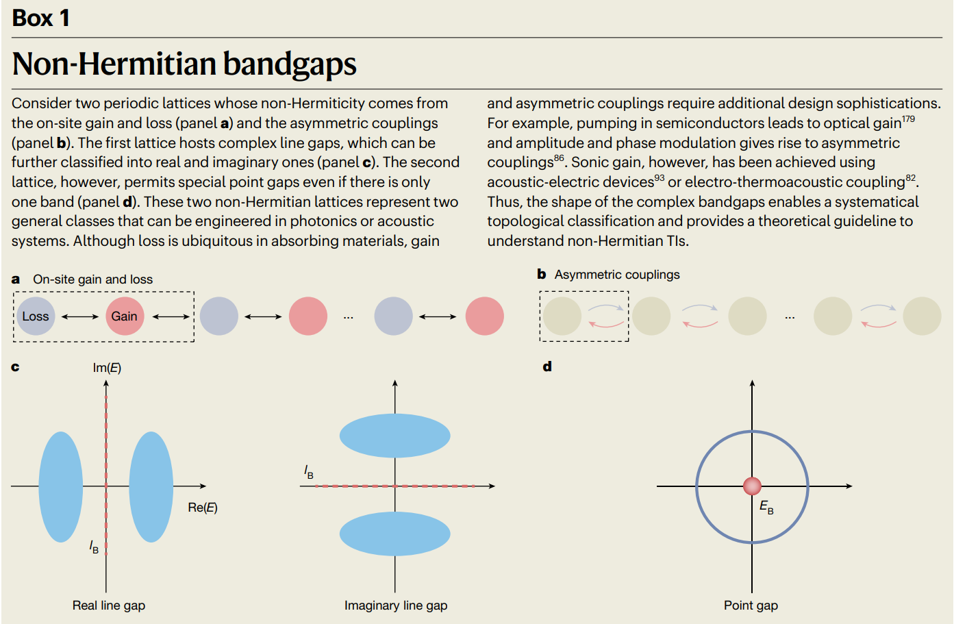 Box. 非厄米带隙。 考虑两种周期性格子,其非厄米性分别来源于原位增益/损耗(a)或者非对称耦合(b),前者会出现线带隙,可进一步分为实带隙和虚带隙(c),后者出现特殊的点带隙(d)。