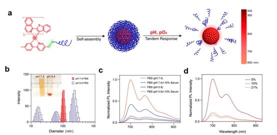 近期,化学化工学院蒋锡群教授课题组报道了一种可被酸性和乏氧循序激活的超灵敏磷光纳米探针Ir-D,用于癌症的早期检测。该纳米探针以对氧气敏感的具有深近红外发射磷光铱配合物为内核,通过酸敏感键连接水溶性高分子聚乙二醇为壳。聚乙二醇外壳不仅在循环过程中为纳米探针提供了稳定性和隐身功能,而且还可以作为酸性触发开关打开深近红外信号。利用对肿瘤微环境的酸性和乏氧的两步响应信号放大,结合深度近红外区的信号检测,该探针能够检测小鼠体内数百个肿瘤细胞或微米级的小原位肿瘤和转移灶。