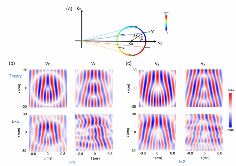 该工作考虑了一种贝塞尔型时空涡旋波束(如图1(a)所示),该涡旋波束可以视为由若干波矢分布在空间频谱中圆上的平面波叠加而成(如图1(b)所示),构成了宽频的脉冲包络。这种时空调制产生的涡旋波束可以局域在二维xz面内,沿着z方向以声速传播,并携带沿着y方向的横向轨道角动量。时空涡旋波束的幅值和相位分布如图1(c)、(d)所示,其时空域幅值分布满足第一类贝塞尔函数,并具有时空涡旋相位。