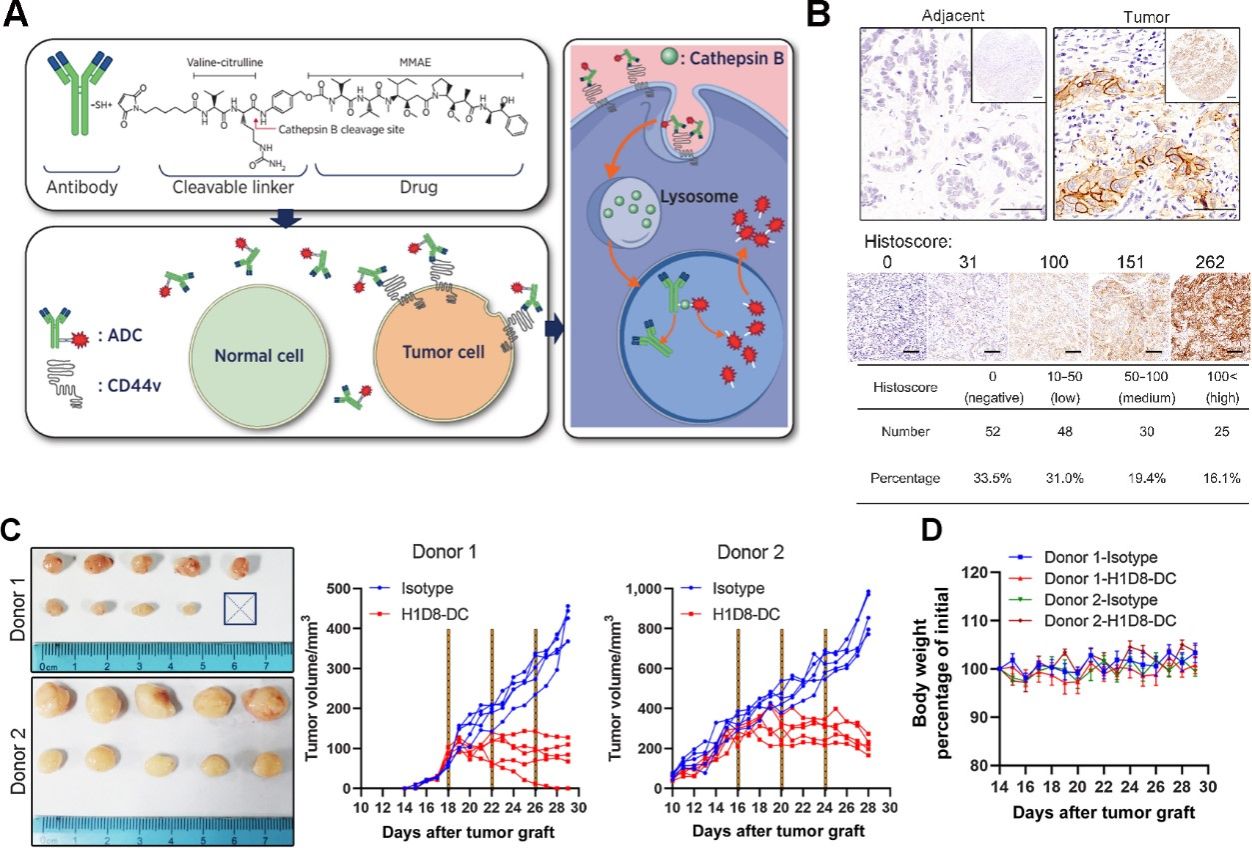 本研究通过TCGA数据库和大量临床标本分析,首先验证了CD44v5 (包含人CD44基因第9外显子的变体)在超过30 %的ICC肿瘤中特异性上调表达(图1)。后续通过一系列相关研究证实该异构体的潜在靶标功能。基于这些研究,开发了一种适用于ADC方法的人源化抗体,该抗体兼具靶标特异性、亲和力以及良好的靶细胞内化功能;通过可切割的缬氨酸-瓜氨酸接头(被Cathepsin B特异性降解)将人源化CD44v5单克隆抗体连接到微管抑制剂单甲基auristatin E(MMAE)上,构建了一种靶向CD44v5的ADC(H1D8-DC)(图1)。该新型H1D8-DC在细胞表面表达CD44v5的细胞中表现出高效的抗原结合和内化。由于Cathepsin B在ICC细胞中高表达,药物在癌细胞中优先释放,而在正常细胞中不释放,因此H1D8-DC在皮摩尔浓度下具有较强的细胞毒性。运用小鼠肿瘤模型进行的实验数据显示:H1D8-DC靶向CD44v5阳性的ICC细胞,在患者来源的异种移植模型中,抑制肿瘤进展。同时未观察到明显的毒副作用(图1)。研究证明:CD44v5具备成为ICC治疗靶点的潜能,H1D8-DC具有临床转化前景。