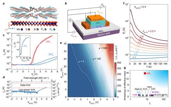 1. 基于C2旋转对称性的SiP2介电材料的高性能MoS2双栅晶体管。(a)MoS2/SiP2异质结构的示意图。(b)基于SiP2介电材料的MoS2双栅器件示意图。(c)基于5-nm-MoS2的双栅晶体管在2 K时通过扫描顶栅电压(红色曲线)和底栅电压(蓝色曲线)时的转移特性曲线。(d)2 K下5-nm-MoS2/SiP2器件的漏电流与外加栅压的关系。(e)5-nm-MoS2/SiP2器件中双栅调控的场效应迁移率。(f)不同SiP2栅压条件下单层MoS2的电阻温度关系。(g)不同电介质的有效质量各向异性比的比较。各向异性比定义为电子有效质量沿相应晶格yx方向的比值。