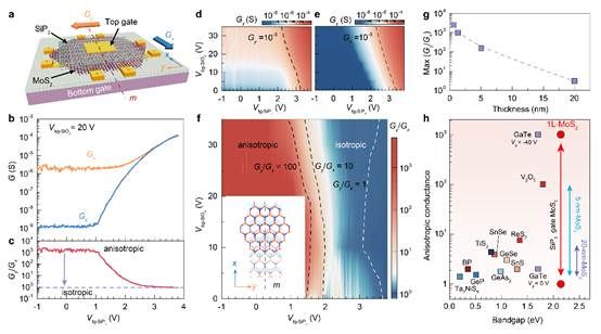 3. MoS2/SiP2异质界面栅极可调的各向异性电学特性。(a)双栅调控的1L-MoS2/SiP2场效应器件示意图。(b)1L-MoS2在背栅为20 V条件下不同方向电导的转移特性曲线(扫描顶栅)。(c)电导各向异性指数随栅极栅压的变化。(d,e)不同方向电导随顶栅和底栅的函数关系。(f)电导各向异性指数随顶栅和底栅的函数关系彩图。(g)MoS2/SiP2器件电导各向异性指数随MoS2厚度的函数。(h)不同层状材料中电导各向异性指数的总结图。