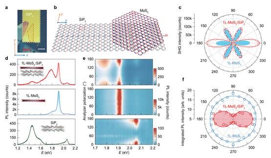 2. 1L-MoS2/SiP2界面的各向异性光学响应。(a,b)1L-MoS2/SiP2异质结构的光学照片(a)和俯视示意图(b),其中MoS2的扶手椅方向与SiP2x方向平行。比例尺为20 μm。(c)平行配置(起偏器和检偏器极化方向平行)下1L-MoS2(蓝色)和1L-MoS2/SiP2(红色)的偏振依赖的二次谐波产生(SHG)强度。(d)77 K时SiP2、1L-MoS2和1L-MoS2/SiP2异质结构的荧光(PL)光谱。(e)对应的PL强度随光子能量和偏振方向变化的二维彩图。(f)1L-MoS2和1L-MoS2/SiP2异质结构偏振依赖的PL强度。