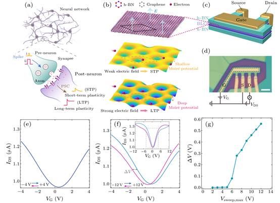 图1:莫尔突触晶体管。(a)生物神经网络及突触示意图。由神经元所发放的尖峰信号的强度会影响突触后膜电流的变化行为,弱的信号会激发短时可塑性行为(STP),强的信号会激发长时可塑性行为(LTP)。(b)由六方氮化硼与石墨烯晶格对齐产生的电场可调的莫尔势场示意图。在弱电场作用下,浅莫尔电势对电子分布实现短时调制;在强电场作用下,深莫尔势将电子强烈局域于石墨烯上层,实现长时调制。(c-d)基于莫尔异质结的突触晶体管的结构示意图和光学图。(e)莫尔突触晶体管在±4 V扫描范围下的转移特性曲线。(f)莫尔突触晶体管在±12 V扫描范围下的转移特性曲线,展示出明显的记忆窗口。(g)记忆窗口大小与扫描电压范围的关系。
