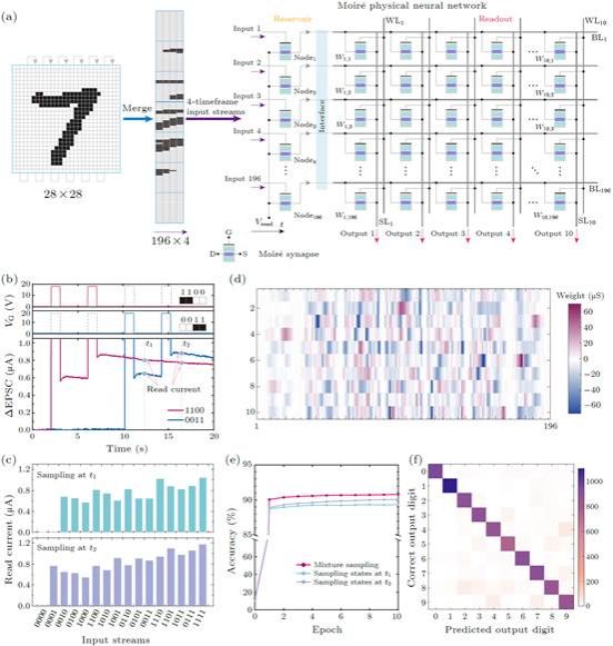 在此基础上,合作团队提出了用于执行同质架构储备池计算的全莫尔物理神经网络(图4a),其中储备池层和读出层均由高度可调谐的莫尔突触晶体管所构建。作为概念验证演示,合作团队基于实验数据展示了莫尔物理神经网络对MNIST手写数字的识别模拟。在储备池状态读取过程中,基于器件鲁棒的动力学特性开发了一种混合采样的模式,即在不同的储备池节点上配置不同的采样时刻,从而可以实现对更多特征的有效提取(图4)。该工作是石墨烯莫尔材料用于神经形态计算的初次尝试,为莫尔电子学的未来发展开辟了一条重要的技术路线。