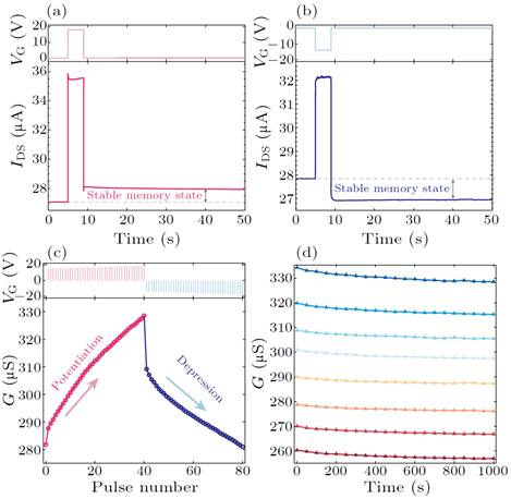 合作团队进一步研究了莫尔突触晶体管在不同外电场刺激下所呈现出的电流响应特性。在强度较低的栅压脉冲刺激下,莫尔突触晶体管的电流增大并在撤去脉冲后的一定时间内,弛豫回初始状态,表现为短时记忆的特性(图2a)。同时,莫尔突触晶体管也能够模拟生物突触的双脉冲异化行为(图2b),表现出丰富的突触动态特性。合作团队进一步研究了莫尔突触晶体管对各种外部刺激(不同脉冲幅值、宽度、数量)的动态响应(图2d-f),结果表明莫尔突触晶体管具有稳定、可重复、可分辨的动力学特性,能够有效区分不同的输入信号,从而可用于实现物理储备池计算系统。而在强度较高的栅压脉冲刺激下,莫尔突触晶体管的电导出现了非易失的增强或抑制,实现了从短时可塑性到长时可塑性的行为转变(图3a-b)。同时,合作团队发现,莫尔突触晶体管的电导在脉冲序列作用下可以实现大范围连续调控(图3c),并且具有良好的多态保持特性(图3d),从而可以作为典型的权重器件。