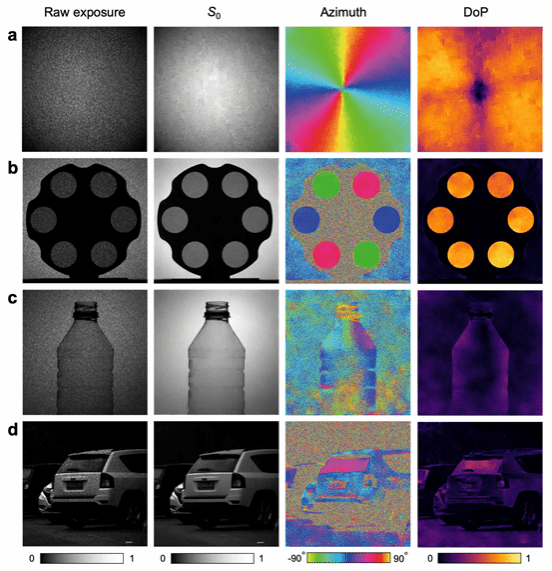 图2. 全Stokes偏振成像。使用所提出的超构表面偏振相机拍摄的室内(a到c)和室外(d)照片。在每种场景下,都展示了原始曝光图像、S0、幅角和偏振度。