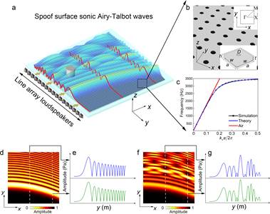 图1. (a) 在声学人工体系中激发和调制Airy-Talbot声束的原理示意图;(b) 声学超表面设计;(c) 人工声学表面所承载的伪表面波模式的色散曲线;(d-g) Airy-Talbot声束的振幅分布图和两个自成像平面处的振幅剖面图。