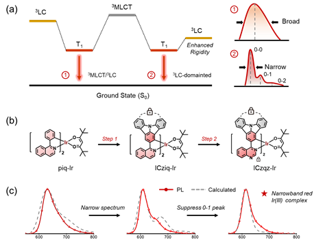 有机发光二极管(OLED)作为一种主流的平面显示技术,受到了企业界和学术界的广泛关注。铱配合物由于其较短的磷光寿命、较高的量子产率以及易调节的发光颜色,已经在商用的绿光和红光OLED材料方面取得了巨大的成功。然而,铱配合物普遍存在的发光谱较宽、色纯度较差的问题,严重制约其在高清、高色域显示面板中的应用。虽然当前热门的多重共振热活化延迟荧光(MR-TADF)材料可以显示窄谱带发射和高发光效率,但是其较长的三线态寿命会导致相应的OLED器件效率滚降非常的严重。目前针对铱配合物光谱窄化及其内在原理的深入探究相对匮乏,阻碍了磷光铱配合物的应用升级。
