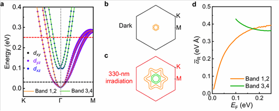 为了从理论上来揭示非互易输运增强的微观机制,课题组通过第一性原理计算构建了(111)晶面的KTO能带(图2a),分别计算了黑暗环境与光照环境的费米面形状(图2b,c)。在330 nm光照下,光生载流子浓度的提高使费米面进一步升高,穿过了Ta 5d轨道更高能量的子带,从而诱导了Lifshitz转变,并使二维电子气的Rashba系数(αR)提高了近10倍(图2d),导致了更大的自旋劈裂。此外,通过对平方磁电阻的拟合,他们发现光生载流子的迁移率也得到大幅提高,载流子弛豫时间(τ)提升了10倍左右。最后,根据表征物理图像的非互易输运系数品质公式γ ∝ αRτ2/EF,定量地印证了非互易输运系数三个数量级的巨大增强。该工作所展示的界面光生载流子分离诱导非互易输运增强的策略,不仅为在非中心对称体系中调控非互易输运提供了新的途径,也为未来新型光控整流器件和自旋轨道器件的发展和应用奠定了基础。