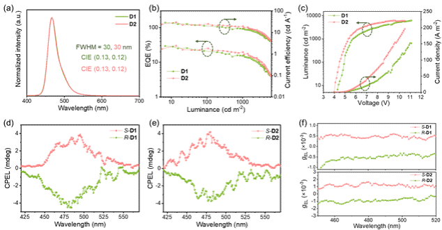 3. (a) 器件的EL光谱和CIE坐标;(b) EQE-亮度-电流效率曲线;(c) 亮度-电压-电流密度曲线;(d)和 (e) CPEL光谱;(f) gEL-波长曲线。
