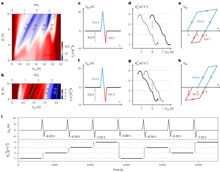 ,C为整数)的能级,表明器件中出现了陈绝缘态,同时也证实了DA-MATBG器件中铁电态与陈绝缘态的共存。在实验中,研究团队共观测到四个不同的铁电陈绝缘态,分别标记为(C,s) = (4, 0), (3, 1), (2, 2)和(1, 3),这里ns 是归一化的载流子密度。通过施加幅值可调的栅压VBG双脉冲(包括正脉冲和负脉冲),研究团队实现了对这些铁电陈绝缘态的非易失开关。如图3c和3f所示,首先,研究团队施加了幅值为10.4 V的正脉冲对器件的铁电极化态进行了重置;其次,通过精准控制负脉冲的幅值,研究团队能够实现目标陈绝缘态的访问。为了确定最终的陈绝缘态,研究团队在VBG脉冲作用前后,对R-1 xy随VTG的变化进行了测量。例如,在施加如图3c所示的电脉冲后,VTG-R-1 xy曲线发生了明显的偏移,表明在撤去栅极电压后,C = 4的陈绝缘态被非易失地切换到C = 2的陈绝缘态(图3d)。对应的铁电陈绝缘态非易失开关的动态示意过程展示在图3e中:在VBG脉冲作用过程中,器件状态在ν-VBG相平面上历经了一个开放轨迹,使得在脉冲前后,器件具有不同的载流子密度。栅压脉冲对铁电陈绝缘态的非易失开关过程具有可逆性。如图3f-h所示,团队通过改变负脉冲幅值,实现了从C = 2到C = 3的陈绝缘态的非易失性切换。陈绝缘体的非易失切换不止局限在这些态中,进一步通过准确控制脉冲的幅值,研究团队展示了任意陈绝缘态能级之间的选择性非易失铁电开关。