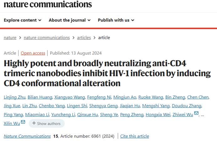 2024年8月13日,吴稚伟和吴喜林课题组在Nature Communications发表了题为“Highly potent and broadly neutralizing anti-CD4 trimeric nanobodies inhibit HIV-1 infection by inducing CD4 conformational alteration”的研究论文。该研究发现强调了抗CD4纳米抗体在HIV治疗中的高效且广谱的效果,对推进HIV的临床治疗具有重要意义。凯发k8官网医学院吴稚伟教授和吴喜林研究员助理教授、清华大学张林琦教授、天津大学王亚鑫副教授和中科院武汉病毒所刘雅兰副研究员为论文的共同通讯作者;凯发k8官网医学院博士生朱林静、黄碧莲为本文共同第一作者。同时特别感谢凯发k8官网化学化工学院郑鹏教授、凯发k8官网市第二医院魏洪霞主任和中国医学科学院薛婧研究员等的大力支持。该研究得到了国家自然科学基金(No.32370988, 31970149 and U22A20335) 和江苏省自然科学基金重点项目(Grant# ZDA2020014),国家自然科学基金重点研发计划(2023YFC2306600),国家十三五传染病重大专项(2018ZX10301406)等项目的支持。
