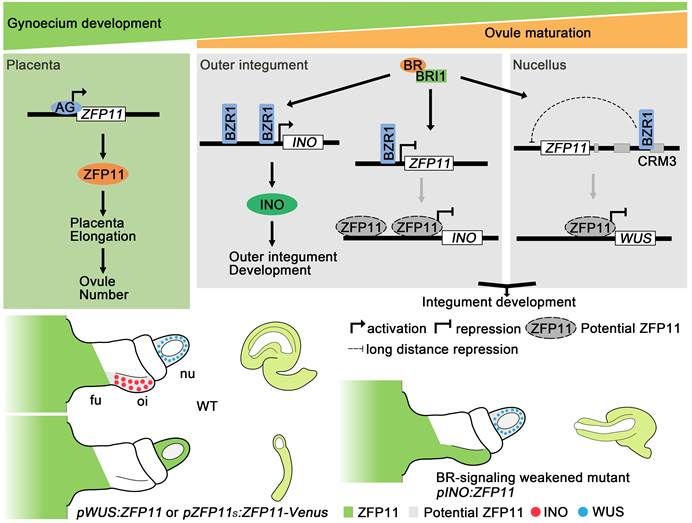 生命科学学院孙博课题组报道了拟南芥中BR信号通路和转录因子AG组织特异性调控C2H2型锌指蛋白ZFP11(ZINC FINGER PROTEIN11)表达以促进雌蕊和胚珠发育的分子机制。该研究通过对ZFP11的突变体、过表达植株和转基因回补系的分析,结合相关分子和细胞生物学实验结果,发现花发育第7期的雌蕊胎座组织中AG激活ZFP11表达,ZFP11促进胎座伸长以产生足够数量的胚珠;在胚珠发育过程中,ZFP11的表达被限制在珠柄中以维持胚珠的正常发育。进一步分析表明,BR信号下游转录因子BZR1(BRASSINAZOLE-RESISTANT 1)除了直接激活外珠被调控关键基因INOINNER NO OUTER)表达以外,还结合到ZFP11启动子上并沉默其在外珠被的表达;珠心区ZFP11的表达则由位于下游的3’调控元件和相应的转录因子(如BZR1)抑制。在BR减弱的突变体或者pINO:ZFP11-eGFP转基因植株中,外珠被异位表达的ZFP11下调INO表达水平,造成外珠被发育缺陷;而在3’元件缺失的转基因材料或者pWUS:ZFP11-eGFP转基因植株中,ZFP11在珠心区异位表达并沉默WUS,造成更加严重的珠被和胚囊发育缺陷。