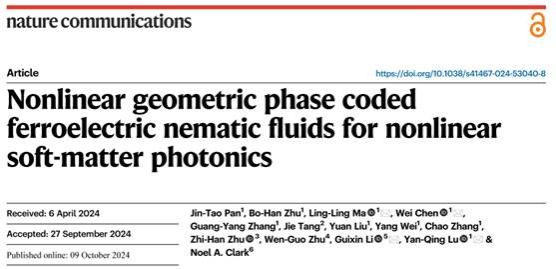 论文信息: J.-T. Pan, B.-H. Zhu, L.-L. Ma. et al. Nonlinear geometric phase coded ferroelectric nematic fluids for nonlinear soft-matter photonics[J]. Nature Communications 15, 8732 (2024).