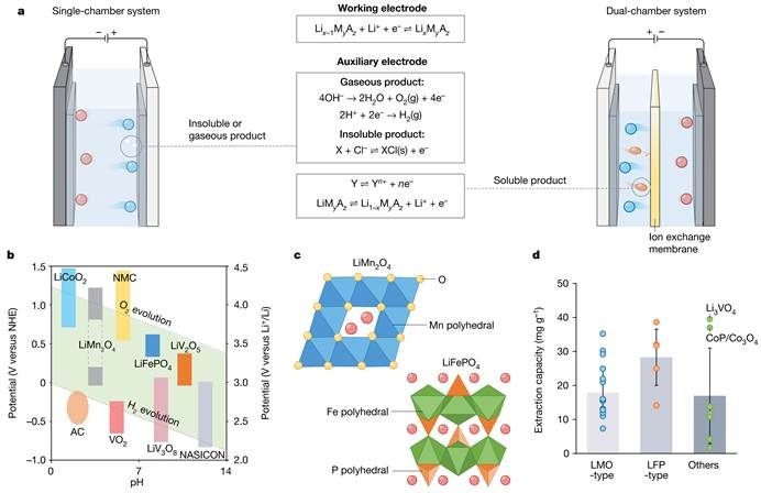 文章还探讨了基于电化学的分离技术及其在低品质卤水提锂中的重要潜力。与吸附法类似,该方法基于锂离子电池电极材料对锂离子的选择性进行锂资源提取,但同时可以通过外加电压对电极材料的工作电位进行更为精确的调控,从而相比于吸附法进一步提升体系的选择性,并且提升提取速率。由于电化学反应的引入,作者着重突出了从工作电位的角度筛选工作电极材料的重要性,同时也从反应产物的视角对辅助电极的类型以及相关的电化学反应装置构型进行的分析和梳理。