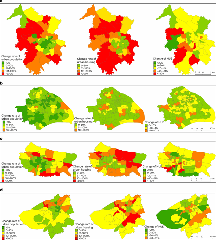图3|四个典型城市的内城区详细示意。a–d.2010年到2020年间,四个代表性城市下辖区的城市人口和住房变化率,以及住房利用效率(HUE)的变化:长沙(a)、上海(b)、石家庄(c)和苏州(d)。