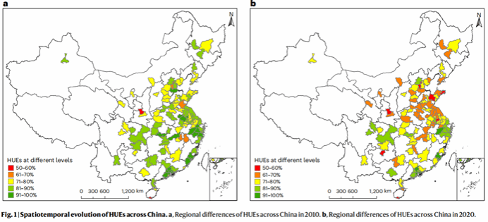 图1|中国住房利用效率(HUE)的时空演变。a.2010年中国各地区住房利用效率(HUE)的区域差异。b.2020年中国各地区住房利用效率(HUE)的区域差异。