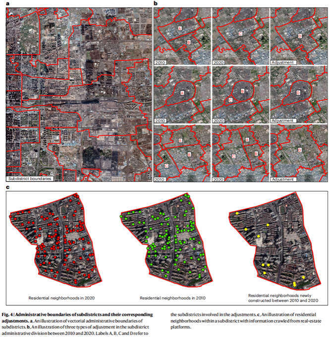 图4|辖区行政边界及其相应调整。a.辖区区的矢量行政边界示意图。b.2010年到2020年期间,辖区行政划分中的三种调整类型示意图。标签A、B、C和D分别表示涉及调整的辖区。c.从房地产平台抓取信息的辖区内住宅小区示意图。