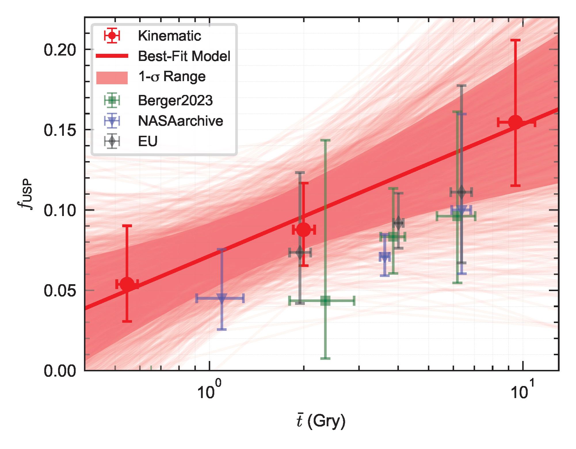 研究团队进一步分析,得出了超短周期行星系统的出现率随年龄的演化规律,发现超短周期行星系统的出现率随年龄增长而上升(图2)。这一发现表明,大多数超短周期行星可能是在数十亿年之后形成的,不太可能以极早期形成模型(如盘迁移模型)为主要形成途径。
