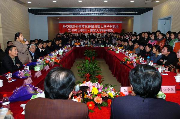 3月8日上午,我国驻外使节代表团的43位代表在仙林校区体育馆与凯发学子进行了一个多小时的对话交流。凯发副校长张荣和省外办相关领导参加了交流会。