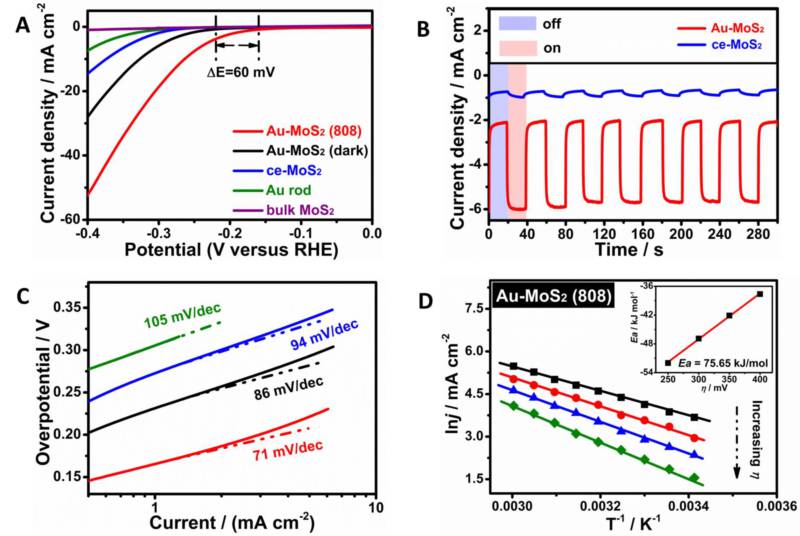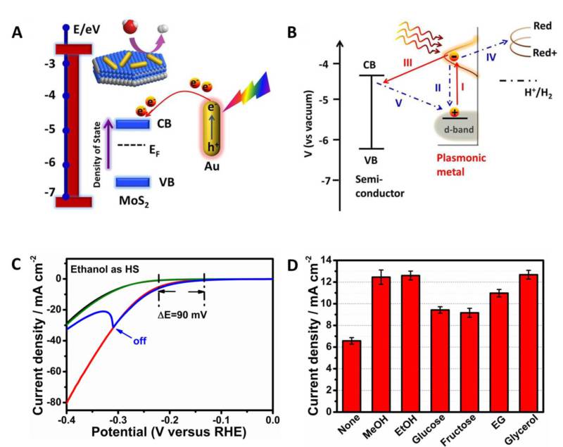 凯发k8官网化学化工学院夏兴华课题组潜心于局域化表面等离子体共振(LSPR)增强红外光谱和生物分析等方面的研究(Chemical Communication., 2014, 50, 7787;2014, 50, 5480;Analytical Chemistry, 2013, 85, 1053)。近期,他们首次报道了一种等离子体热电子增强HER的电化学体系——Au纳米棒/MoS2纳米片层复合材料(Au-MoS2)(图1)。该体系通过金纳米棒的LSPR效应活化MoS2材料对水分解制氢的电催化活性。其中,Au纳米棒高效吸收可见光能产生局域表面等离子体共振,激发电子-空穴对,由于Au 纳米棒和MoS2半导体间较低的肖特基势垒,热电子能注入MoS2纳米片导带,提高MoS2电荷密度,使催化剂的能级与HER能级更加匹配,降低MoS2材料对HER的过电势,HER的转化频率(Turnover frequency)达到了8.76 s–1,是目前该类催化剂的最高值(图2)。他们还提出了加入空穴消除剂(如甲醇、乙醇、葡萄糖等还原剂)来提高电子-空穴对的分离效率的策略,使更多的热电子能有效地注入MoS2催化剂的导带,进一步提高HER的催化效率(图3)。该工作5月28日在线发表于《美国化学会志》 (J. Am. Chem. Soc. 2015, DOI: 10.1021/jacs.5b01732),论文第一作者为13级硕士生施毅同学。该工作得到国家自然科学基金面上项目(21275070)、国家973基础研究项目(2012CB933800)和国家重大科研仪器设备研制专项(21327902)等的支持。(化学化工学院)