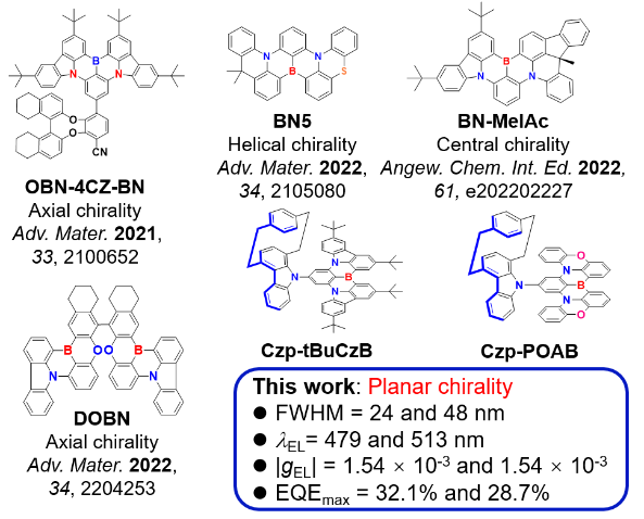 多重共振TADFMR-TADF)发光材料通过缺电子硼/羰基和富电子氧/氮产生共振效应,使前沿分子轨道的键合/反键合最小化,以减少稠环结构的振动弛豫,从而导致窄的FWHM和高的发光效率,多数显示优异的OLED器件性能。因此,手性MR-TADFCP-MR-TADF)材料具有制备高性能和优异色纯度CP-OLED器件的潜力。然而,到目前为止,关于这类材料的研究还十分有限,并且主要集中在轴手性、螺旋手性和碳中心手性方面。然而,作为重要的手性元素之一,平面手性在CP-MR-TADF材料领域仍然未被报道。