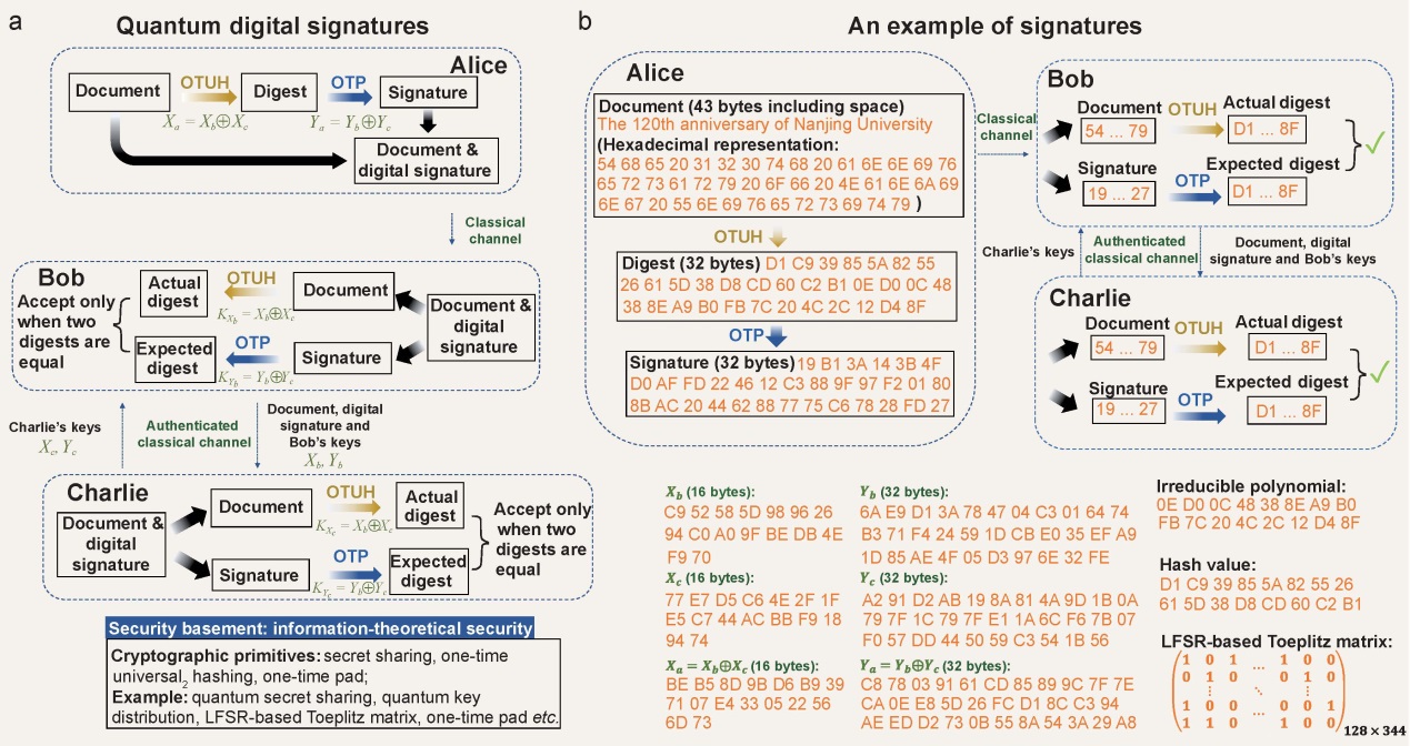 近期,我校物理学院、固体微结构物理国家重点实验室、人工微结构科学与技术协同创新中心陈增兵-尹华磊课题组联合矩阵时光数字科技有限公司在量子安全技术方面取得重要突破,首次基于非对称量子密码在超过100公里距离下成功实现不可否认地传输兆比特图像。该课题组创造性地提出"一次一哈希",结合秘密共享的密钥非对称特性和"一次一密"的加密原理构造了可商用化的量子数字签名框架。以签名一份兆比特的文件为例,该框架将签名速率提升数亿倍。该实用化量子数字签名协议只需消耗数百比特的非对称量子密钥即可实现对几乎任意长的文件进行信息论安全的数字签名,从而确保文件传输的真实性、完整性和不可否认性。与此同时,该量子数字签名框架兼容各种量子秘密共享和量子密钥分发协议。基于此,该团队在实验上演示了全球首个全功能量子安全网络,实现了信息安全的全要素——机密性、真实性、完整性和不可抵赖性——保护,为数字经济、数字货币等提供了技术完备的量子安全底座。