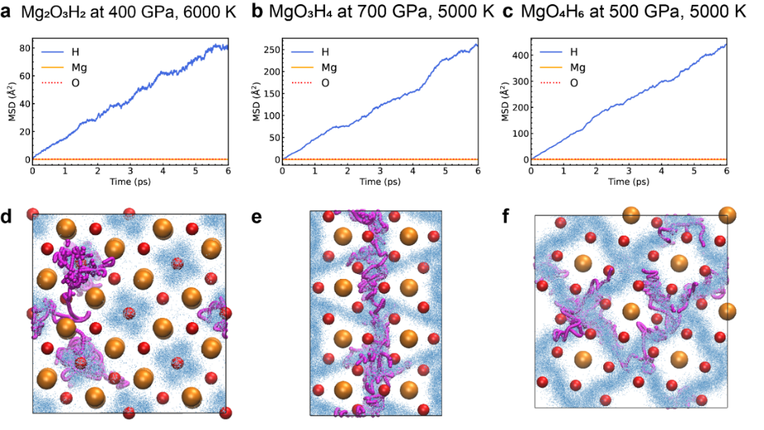 他们用自主开发的基于机器学习和图论辅助的晶体结构搜索方法(MAGUS),结合第一性原理计算,对高压下的镁-氧-氢三元化合物的晶体结构,以及它们在高温高压下的物态进行了系统研究,预测了三种在高压下稳定的镁-氧-氢三元化合物,其组分为Mg2O3H2 (>400 GPa),MgO3H4 (>600 GPa)和MgO4H6 (270-600 GPa)。随后,他们使用第一性原理分子动力学和机器学习分子动力学详细研究了这些化合物在高温高压下的动力学行为,并构建了温度压强相图。模拟结果表明,随着温度升高,三种化合物均有从固态到超离子态再到液态的相变。在镁-氧-氢体系中,超离子态表现为镁-氧框架保持固体行为,而氢则可以像液体一样自由扩散(图1)。将镁-氧-氢三元化合物相图与目前的行星模型对比,发现氧化镁-水化合物的超离子态区间涵盖了天王星和海王星内部的温度压强范围(图2),说明它们很可能在行星内部大量存在。
