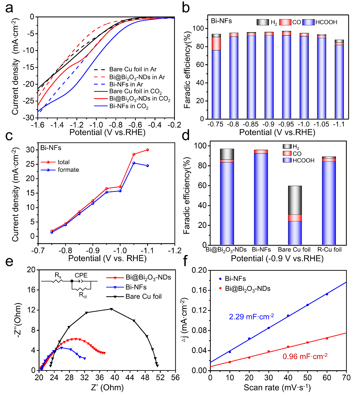图4. Bi-NFs以及其他对比样品的电化学性能。