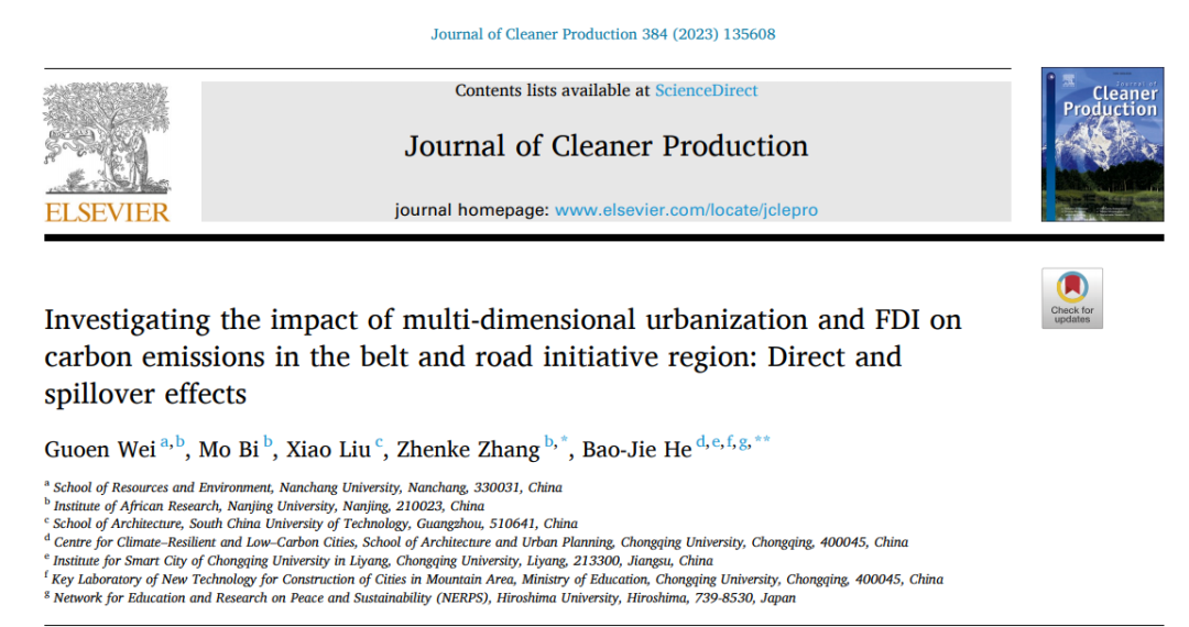 4. Guoen Wei, Mo Bi, Xiao Liu, Zhenke Zhang*, Bao-Jie He. Investigating the impact of multi-dimensional urbanization and FDI on carbon emissions in the belt and road initiative region: Direct and spillover effects,Journal of Cleaner Production,384, 2023,135608. https://doi.org/10.1016/j.jclepro.2022.135608