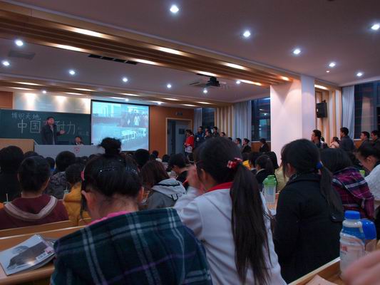 本场讲座采用新颖的访谈形式,由学生会学科部杨同学主持。讲座以一组图片切入,张老师和杨同学以访谈的形式主要讨论了这样一些问题:中国外资企业中的劳动者权益保障问题、后危机时代中国开放型经济面临的贸易壁垒及其应对问题、中国在战略性资源方面的定价权问题以及中国经济发展面临的深层次矛盾等等。