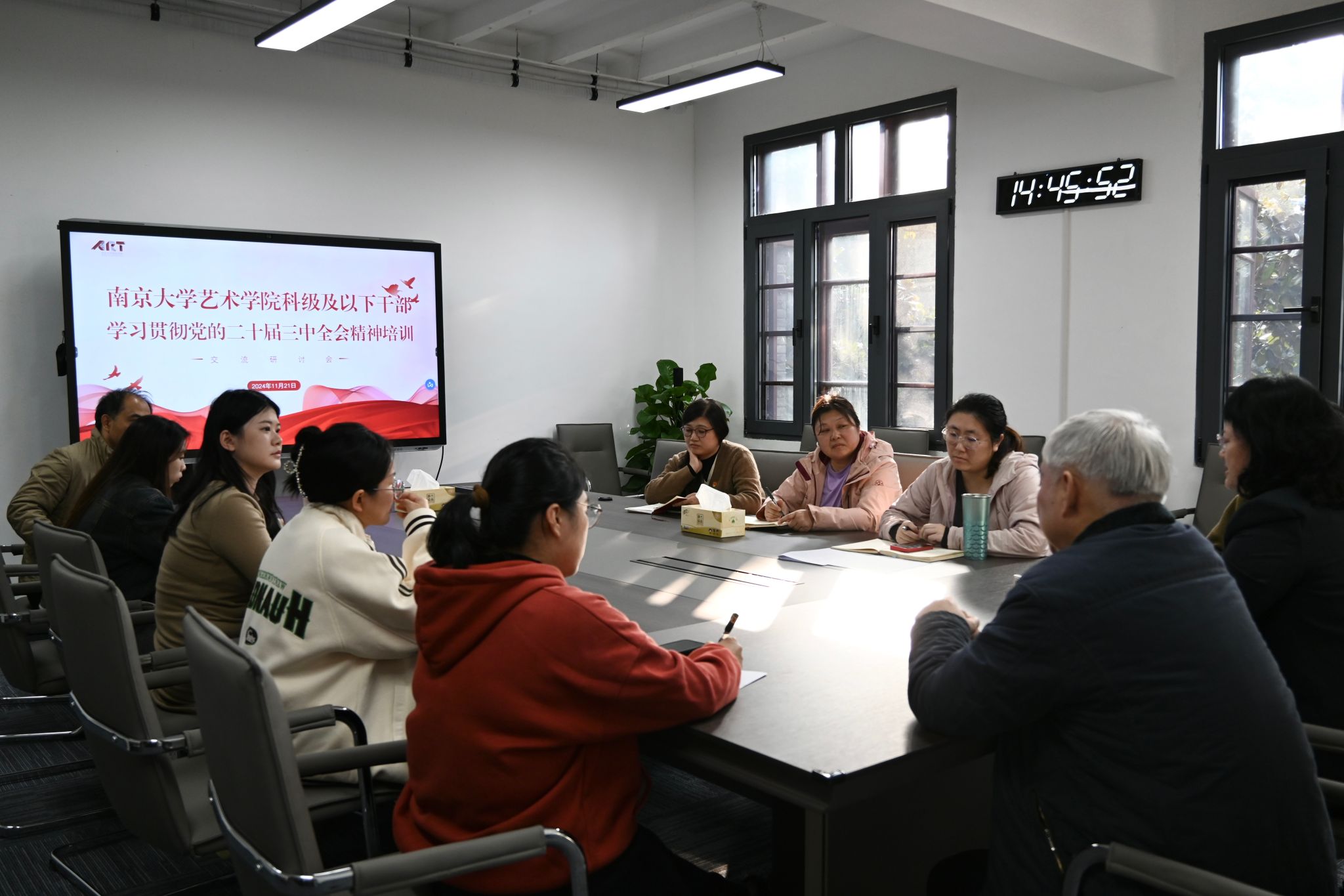 11月20日至21日,艺术学院党委分党校开展科级及以下干部学习贯彻党的二十届三中全会精神培训。本次会议旨在深入学习贯彻党的二十届三中全会精神,把党员干部和师生员工的思想统一到全会精神上来,把力量凝聚到全会确定的各项任务上来,进一步提升学院管理人员的政治素养和履职能力。艺术学院全体管理人员参加培训,党委书记石红梅进行开班动员并参加交流讨论会。