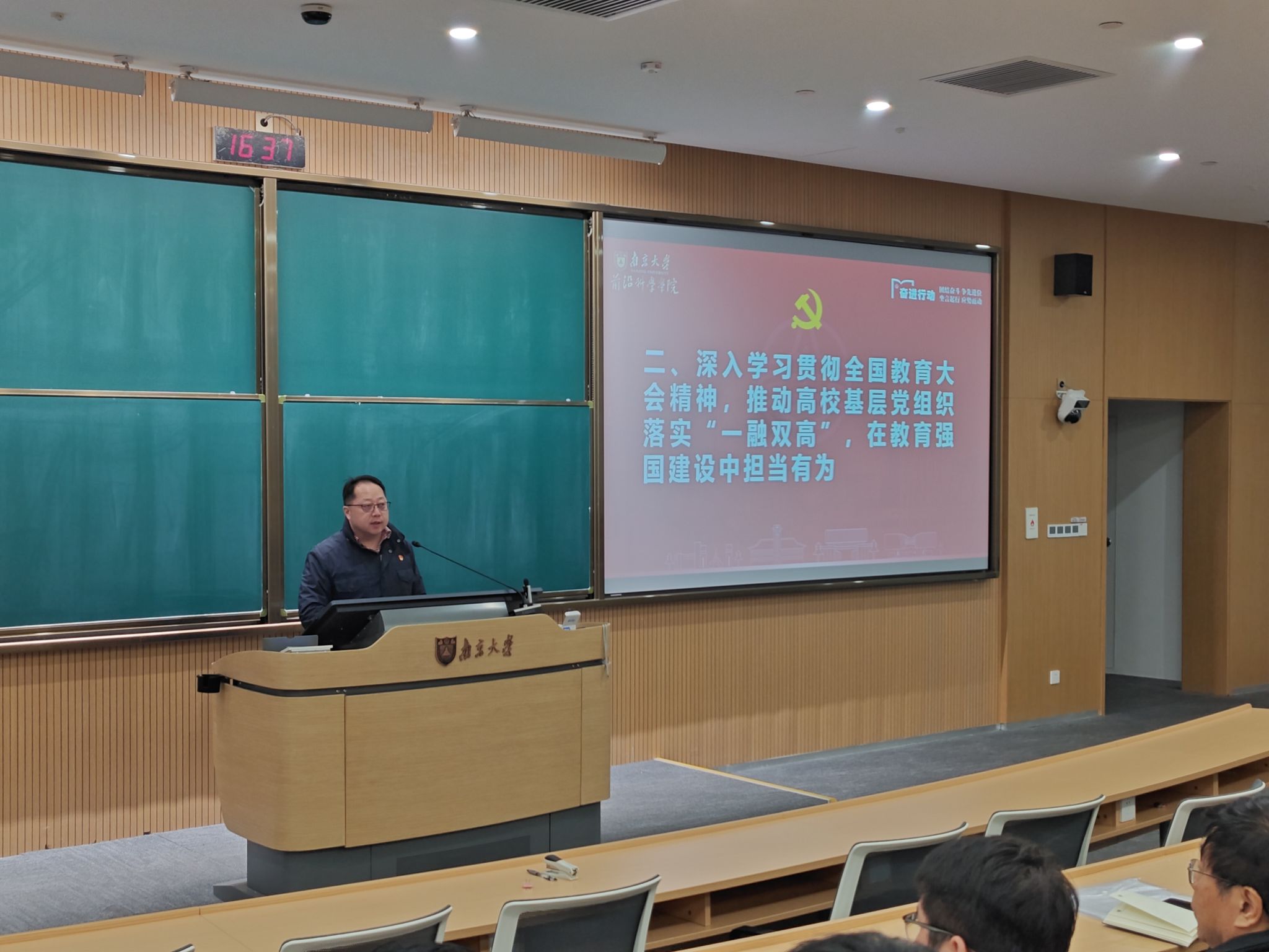 随后,陈谦带领全体党员系统学习《中国共产党普通高等学校基层组织工作条例》。他从《条例》的核心内容入手,逐章节深入解读,重点阐述了如何发挥思想引领作用、完善组织保障和规范党组织建设。他指出,《条例》不仅是学院党建工作的行动指南,更是推动学院事业发展的金钥匙,希望学院党委委员、党支部书记、普通党员都要学深悟透《条例》内容,努力提升学院基层党组织的建设水平。