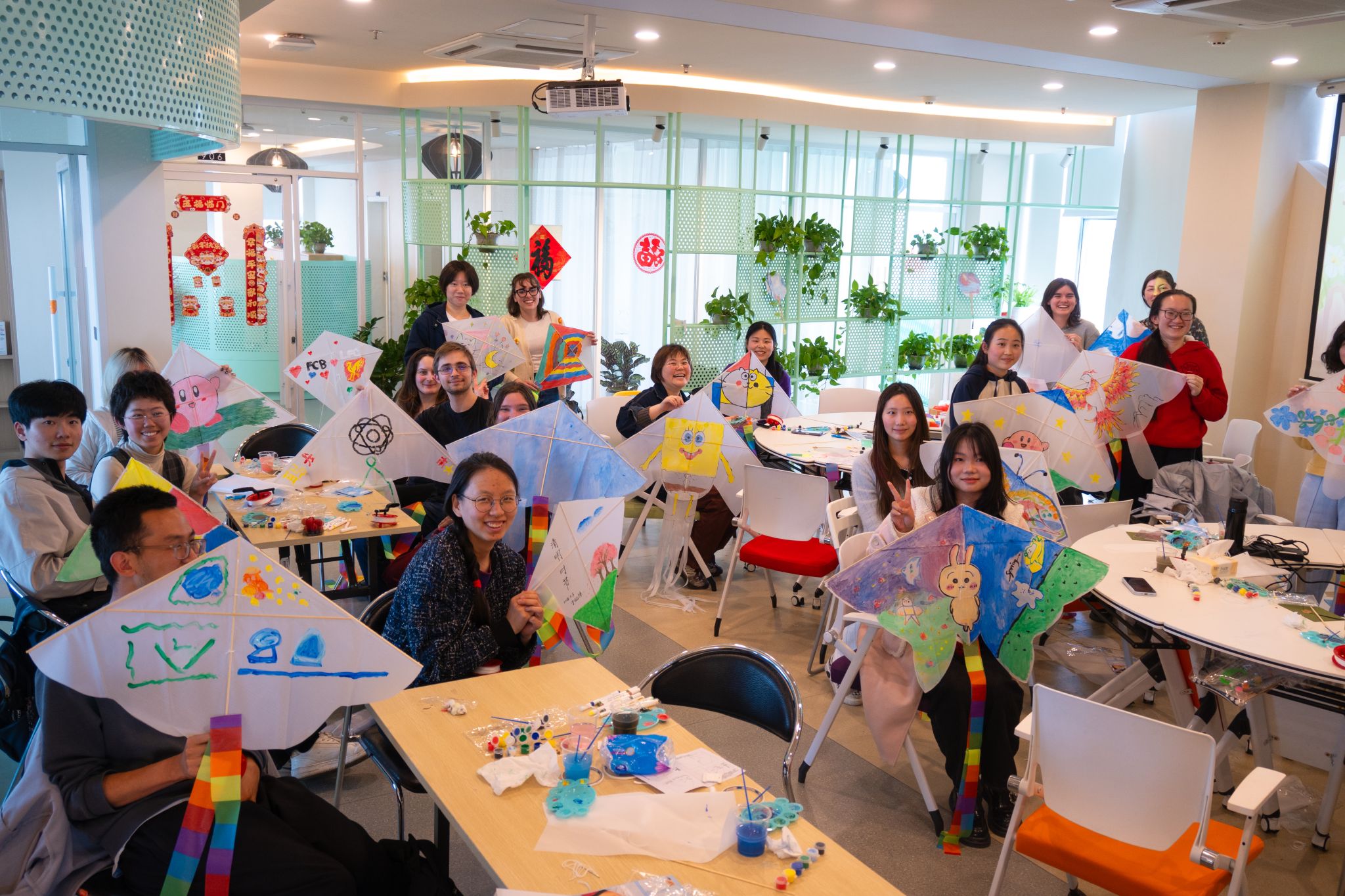 在制作纸鸢的过程中,来自世界各地的同学们也自然地跨越了语言和文化的屏障,彼此帮助、相互了解。当有同学遇到制作的困难时,旁边的同学会主动伸出援手;开始绘制风筝图案时,大家一边绘画,一边相互介绍自己的创作初衷,也毫不吝啬向对方的作品给予肯定与赞美,活动现场不时洋溢着欢声笑语。