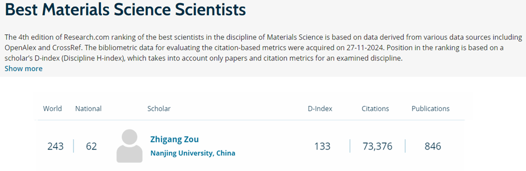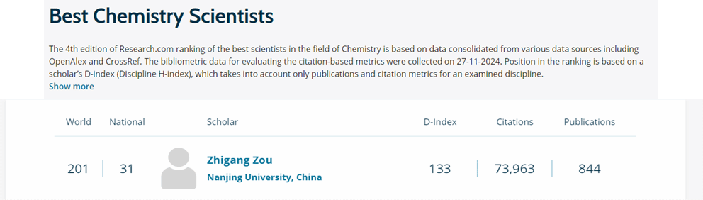 邹志刚教授获Research.com评为化学和材料领域内2025顶尖科学家