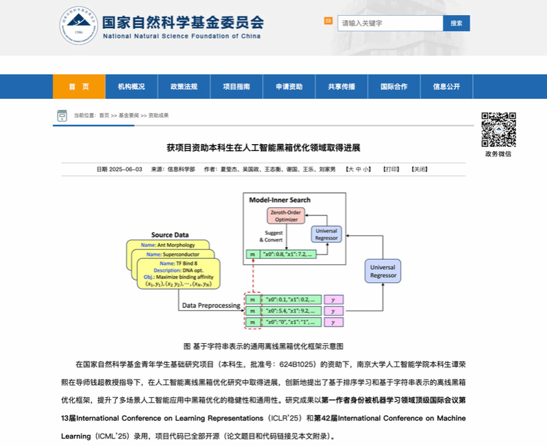 近日,国家自然科学基金委员会官网报道了我校人工智能学院本科生谭荣熙在人工智能黑箱优化领域的研究成果(链接:https://www.nsfc.gov.cn/publish/portal0/tab448/info94976.htm)。